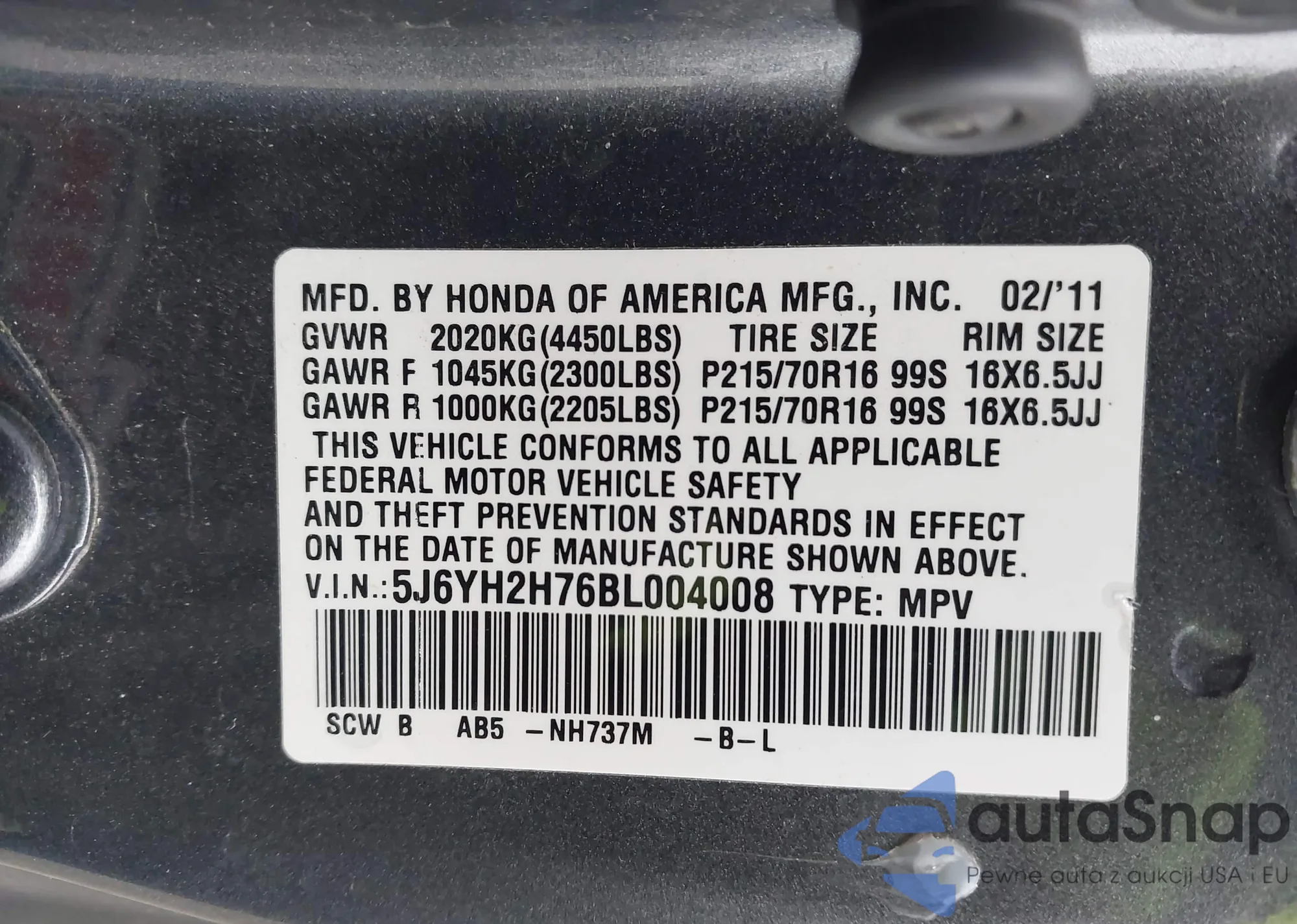 • VIN: 5J6YH2H76BL004008