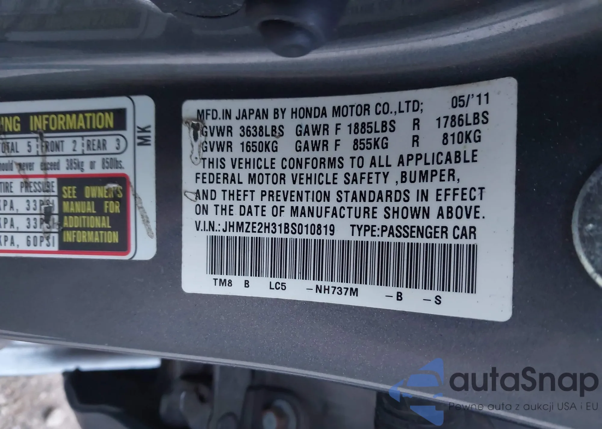 Автомобиль Honda Insight 2011 (VIN JHMZE2H31BS010819) имеет документы, препятствующие регистрации. Могут возникнуть сложности при экспорте и регистрации. Обратитесь к экспертам AutaSnap для поиска альтернатив.