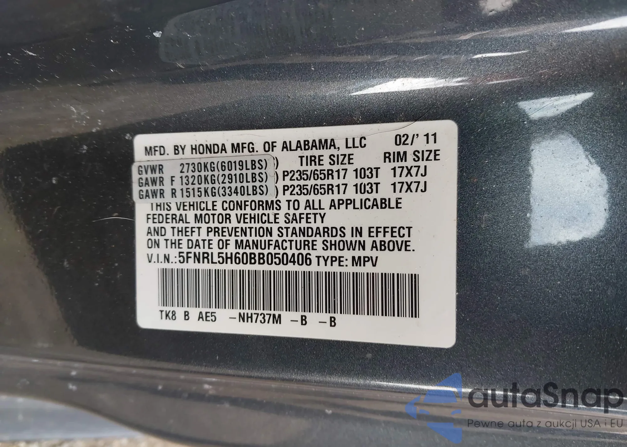 • VIN: 5FNRL5H60BB050406