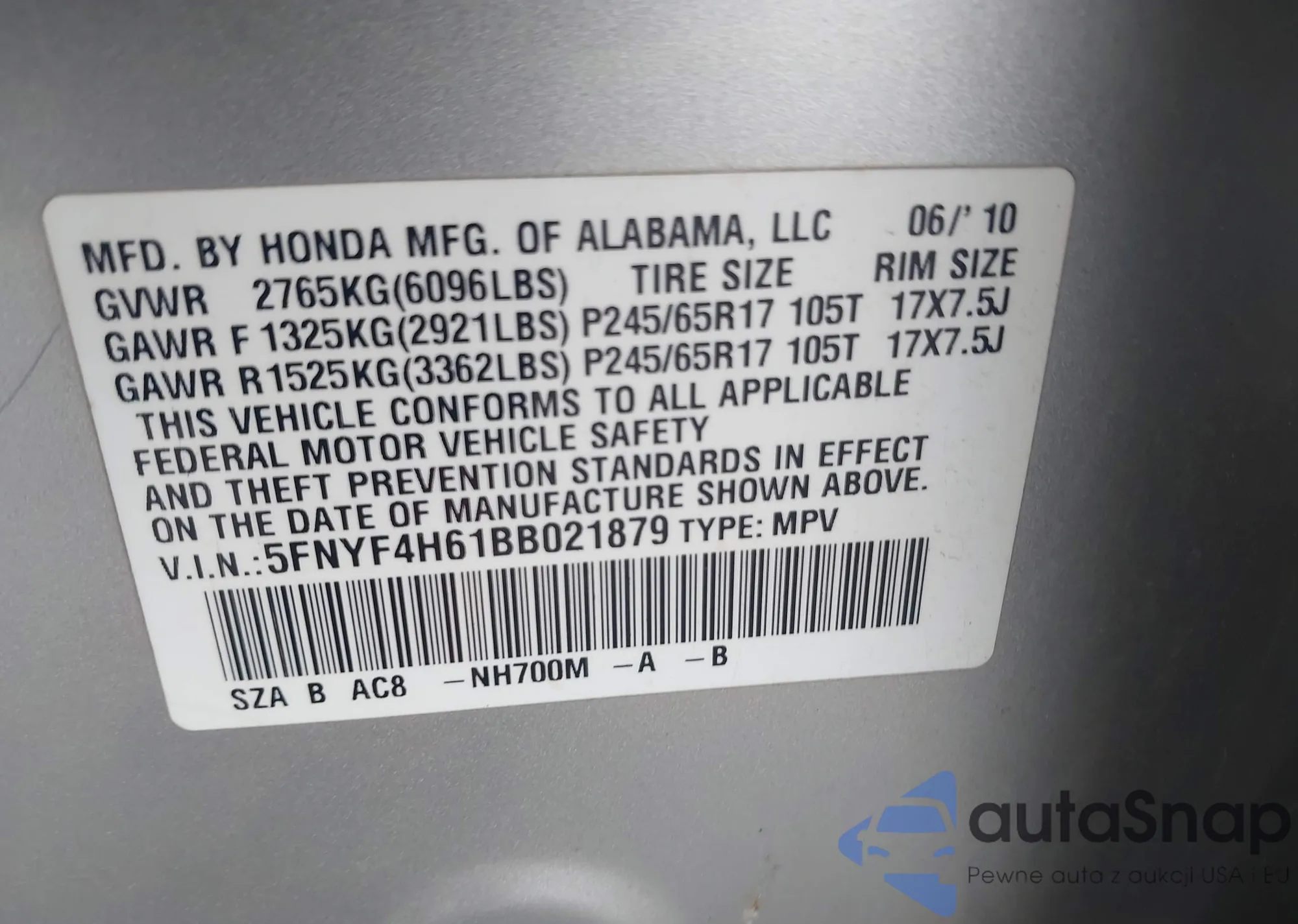 • VIN: 5FNYF4H61BB021879