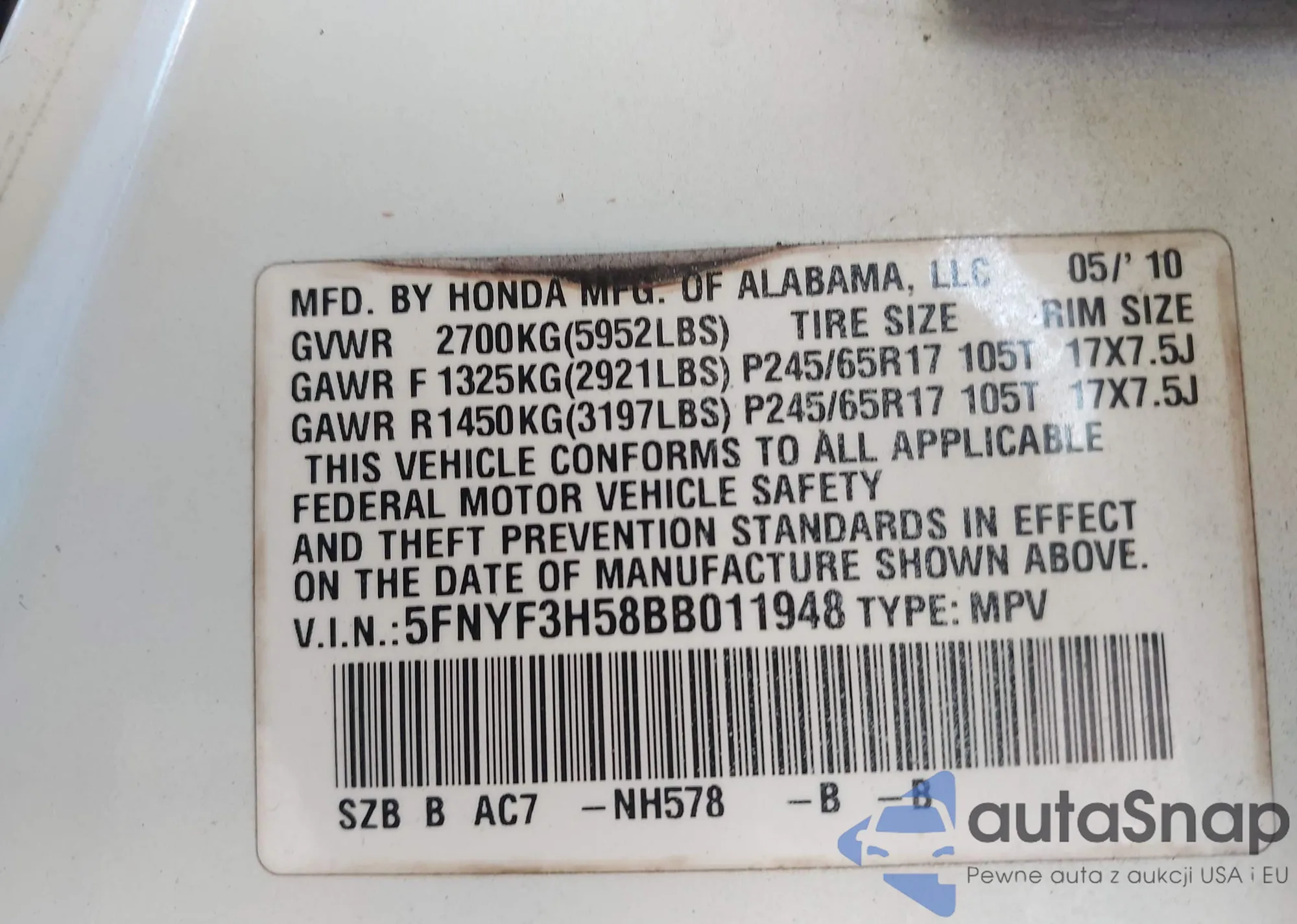 VIN: 5FNYF3H58BB011948