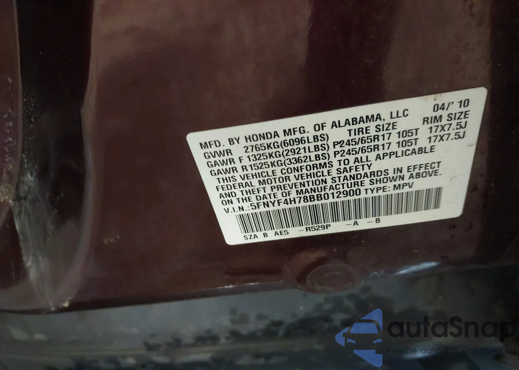 VIN: 5FNYF4H78BB012900