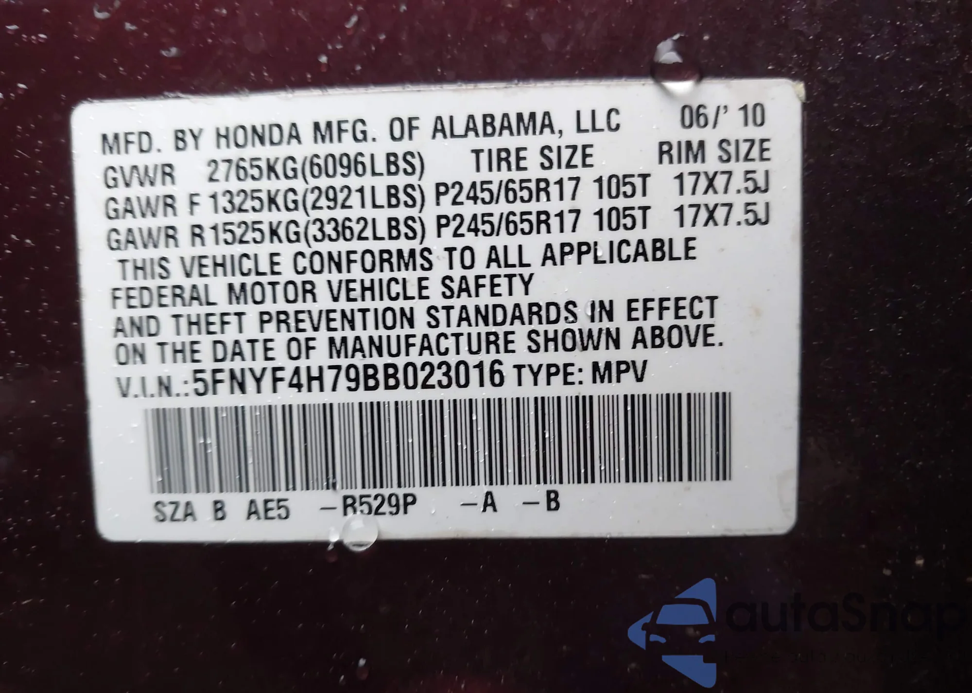 VIN: 5FNYF4H79BB023016