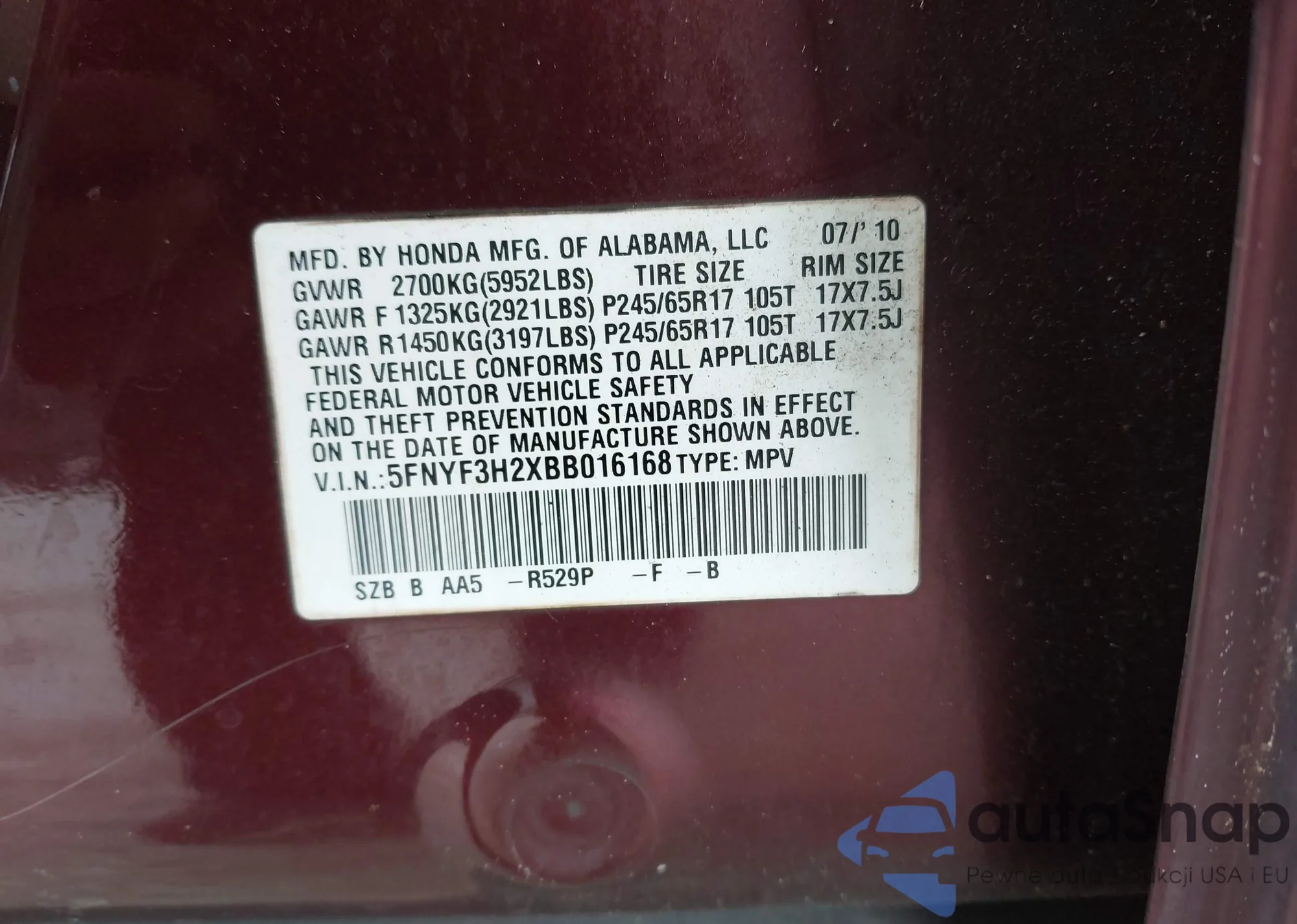 VIN: 5FNYF3H2XBB016168