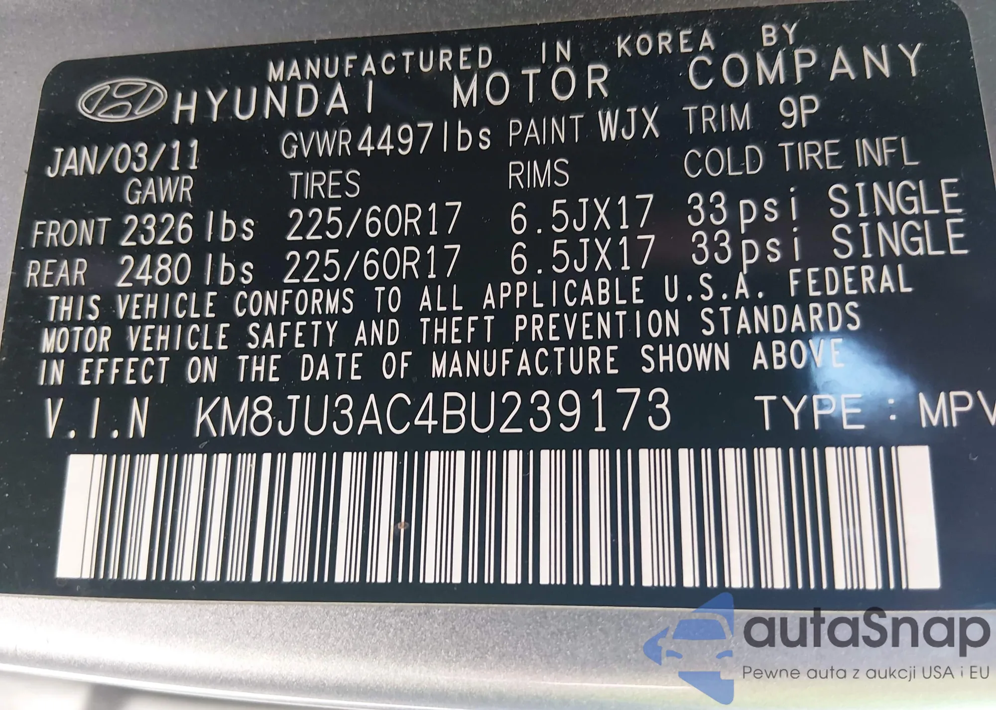 Автомобиль Hyundai Tucson 2011 (VIN KM8JU3AC4BU239173) ранее не участвовал в торгах. Документы чистые, пробег соответствует или ниже среднего по рынку. Продаётся страховой компанией — рекомендуем покупку. Доставка в порт займет около 6–8 недель.
