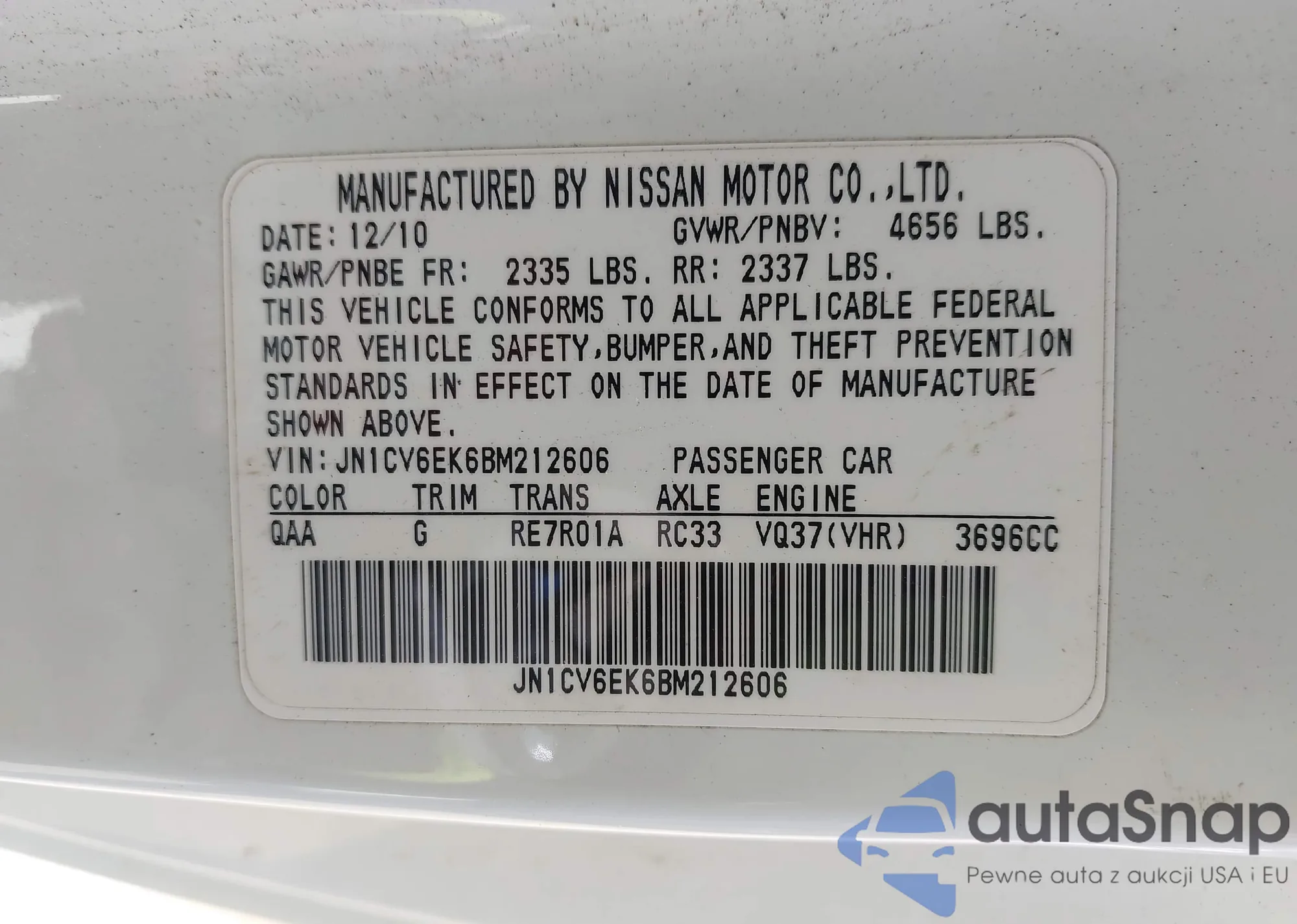 Автомобиль Infiniti G 2011 (VIN JN1CV6EK6BM212606) ранее не участвовал в торгах. Документы чистые, пробег соответствует или ниже среднего по рынку. Продаётся страховой компанией — рекомендуем покупку. Доставка в порт займет около 6–8 недель.