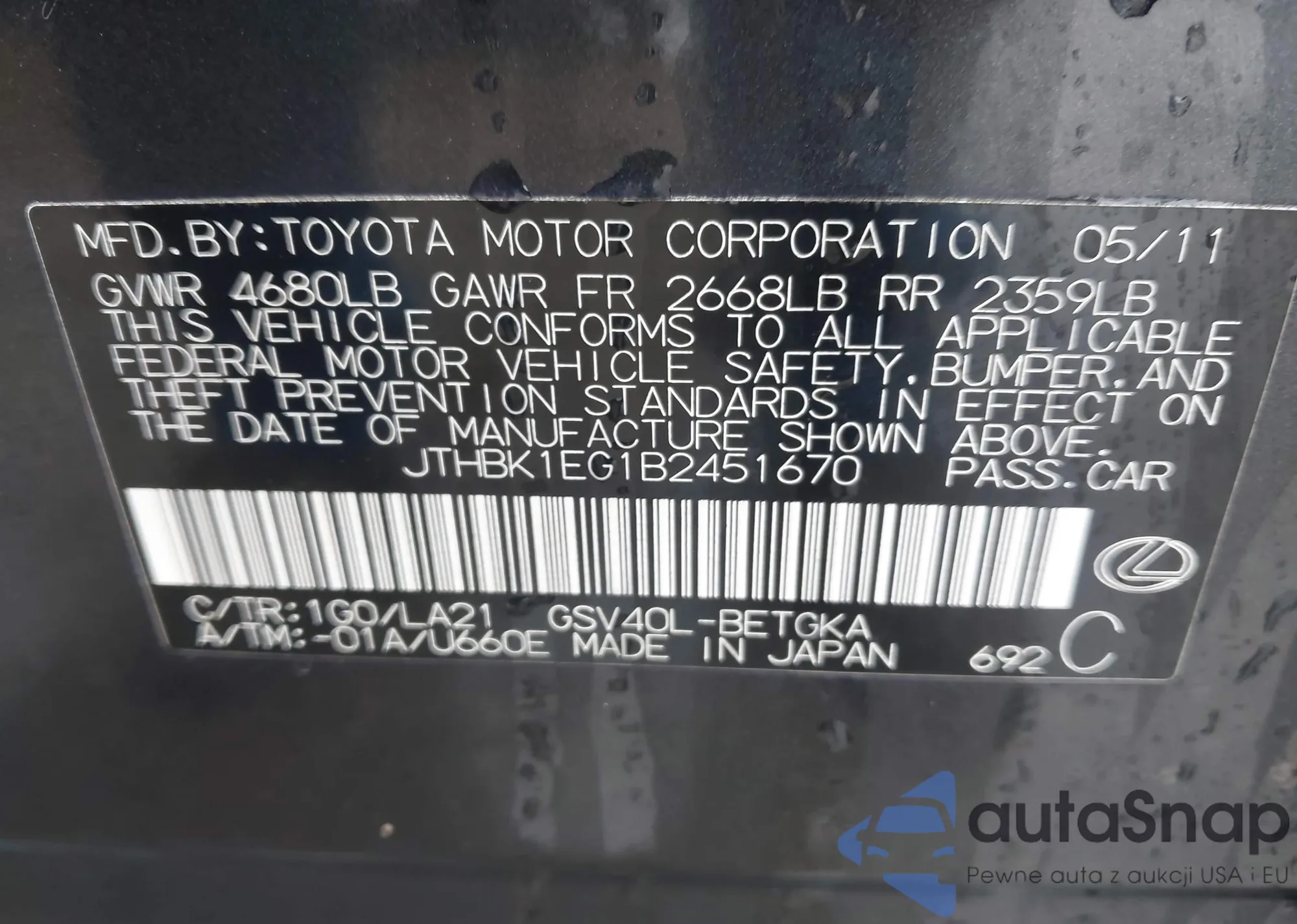 VIN: JTHBK1EG1B2451670
