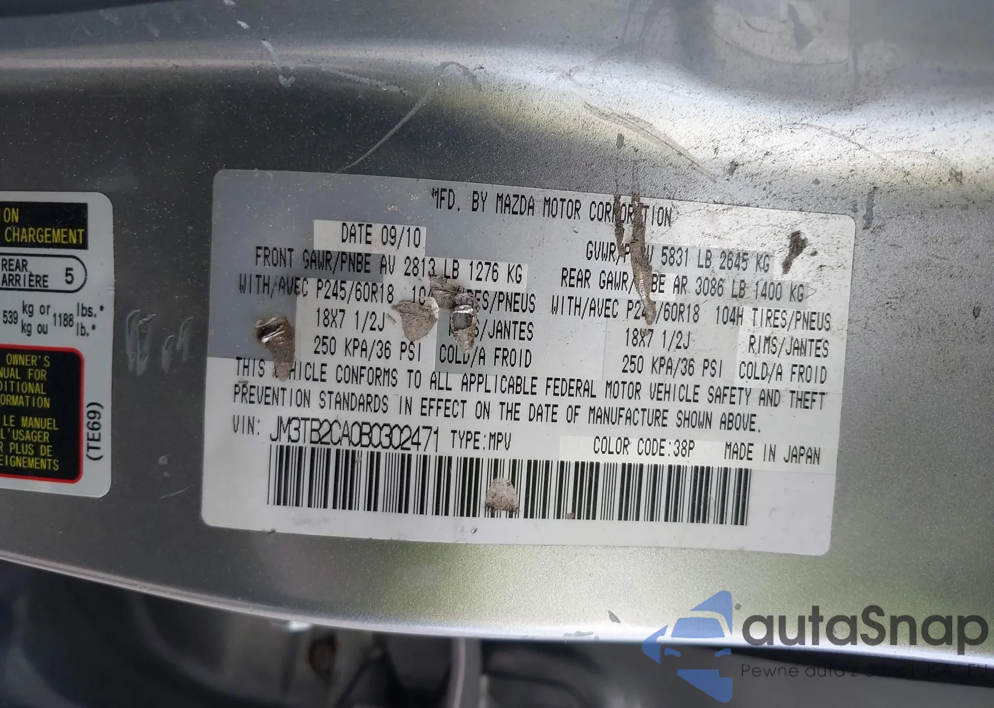 Автомобиль Mazda CX-9 2011 (VIN JM3TB2CA0B0302471) имеет документы, препятствующие регистрации. Могут возникнуть сложности при экспорте и регистрации. Обратитесь к экспертам AutaSnap для поиска альтернатив.