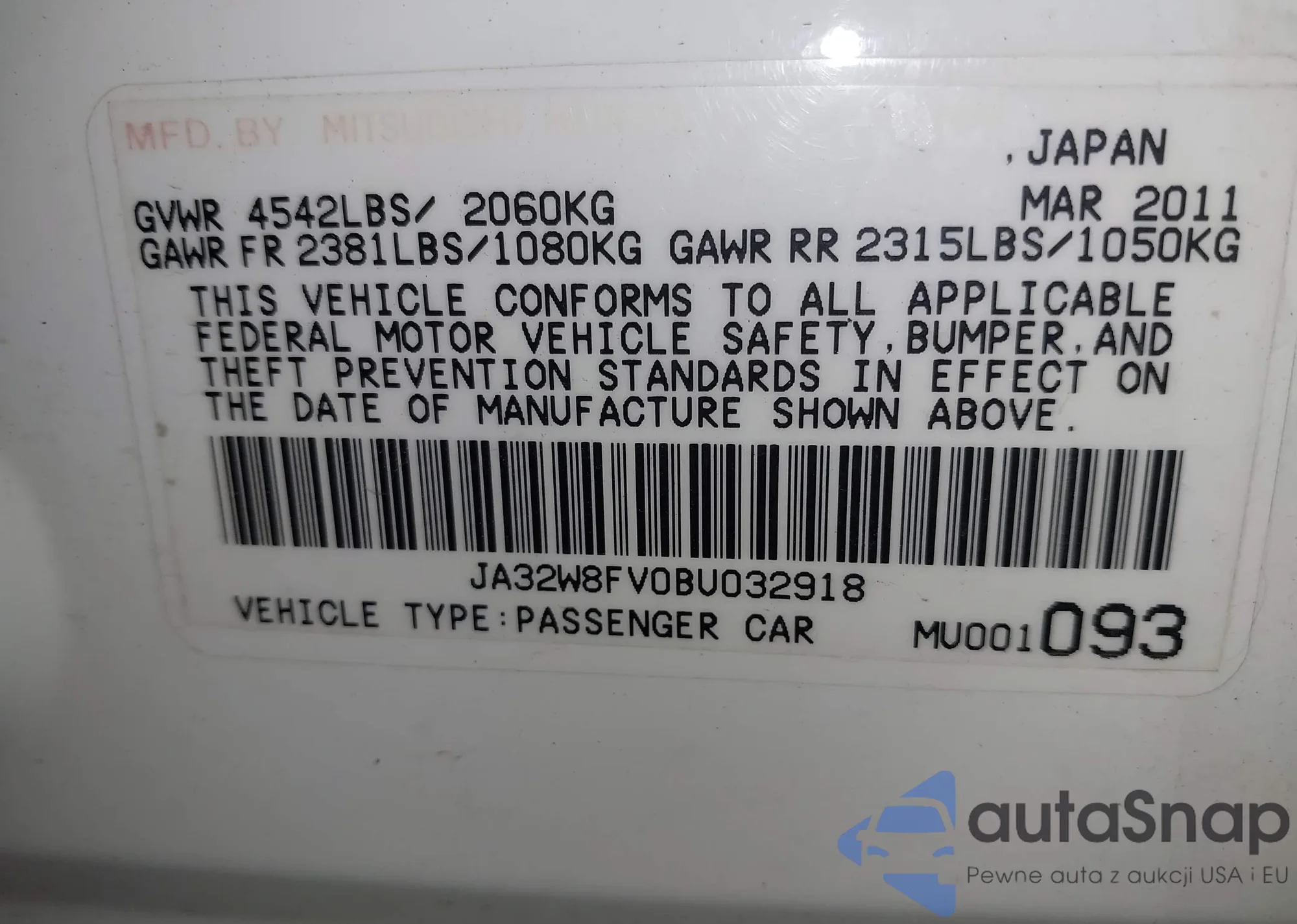 Автомобиль Mitsubishi Lancer Evolution 2011 (VIN JA32W8FV0BU032918) ранее не участвовал в торгах. Документы чистые, пробег соответствует или ниже среднего по рынку. Продаётся страховой компанией — рекомендуем покупку. Доставка в порт займет около 6–8 недель.