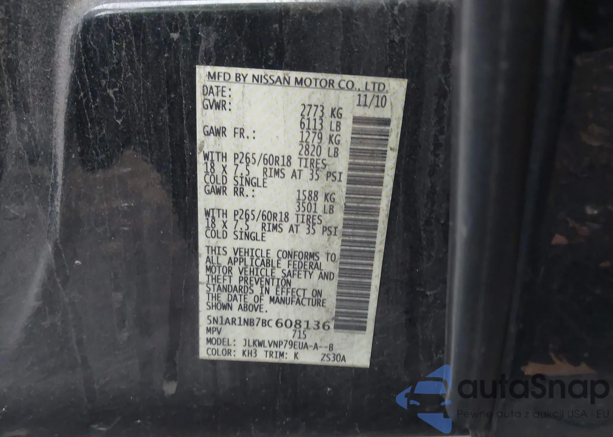 • VIN: 5N1AR1NB7BC608136