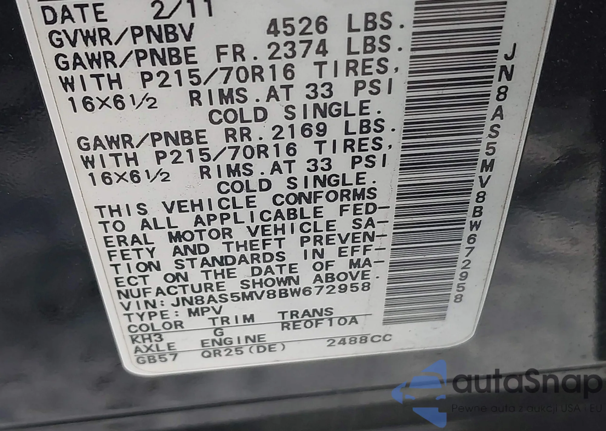 • VIN: JN8AS5MV8BW672958