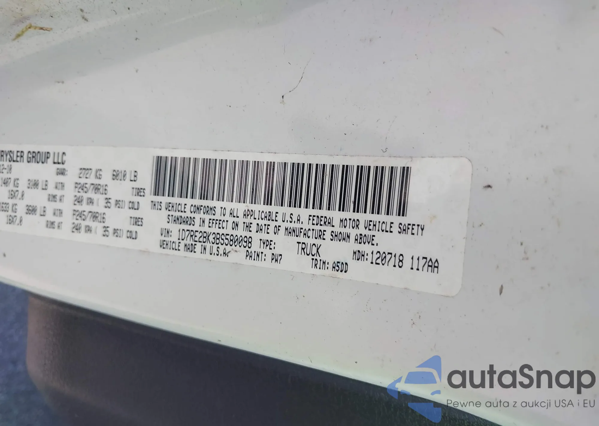 Автомобиль RAM Dakota 2011 (VIN 1D7RE2BK3BS580098) имеет документы, препятствующие регистрации. Могут возникнуть сложности при экспорте и регистрации. Обратитесь к экспертам AutaSnap для поиска альтернатив.