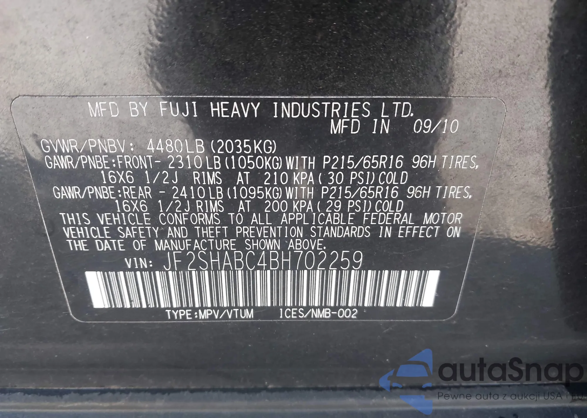 VIN: JF2SHABC4BH702259
