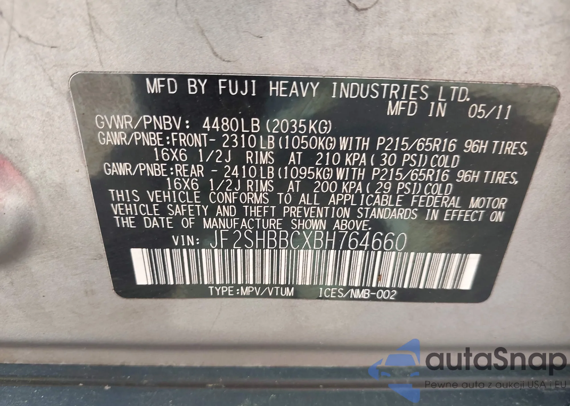 VIN: JF2SHBBCXBH764660