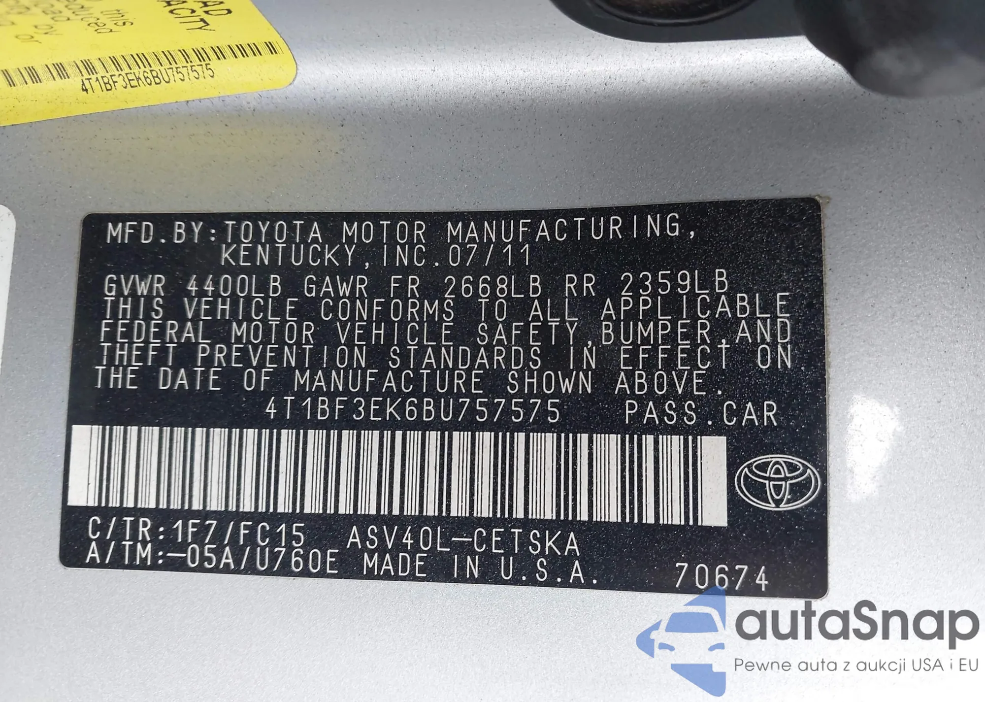 Автомобиль Toyota Camry 2011 (VIN 4T1BF3EK6BU757575) ранее не участвовал в торгах. Документы чистые, пробег соответствует или ниже среднего по рынку. Продаётся страховой компанией — рекомендуем покупку. Доставка в порт займет около 6–8 недель.