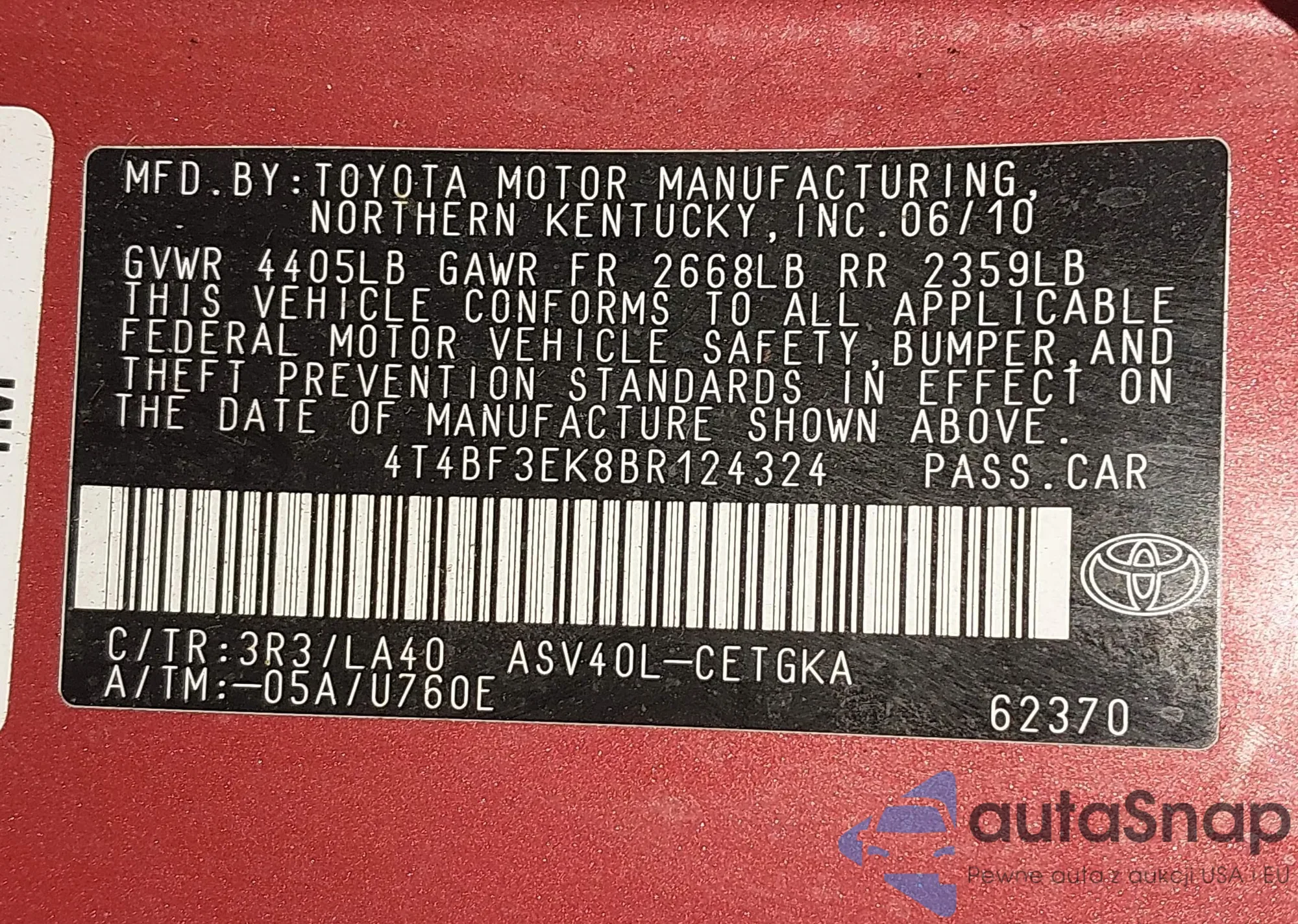 Автомобиль Toyota Camry 2011 (VIN 4T4BF3EK8BR124324) ранее не участвовал в торгах. Документы чистые, пробег соответствует или ниже среднего по рынку. Продаётся страховой компанией — рекомендуем покупку. Доставка в порт займет около 6–8 недель.