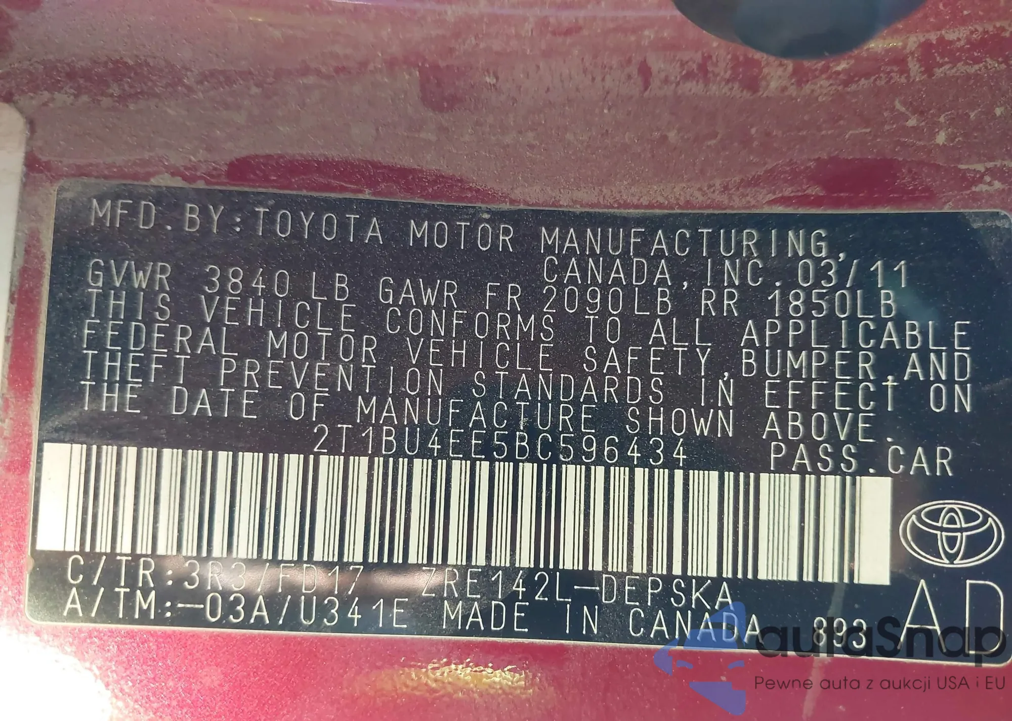 Автомобиль Toyota Corolla 2011 (VIN 2T1BU4EE5BC596434) ранее не участвовал в торгах. Документы чистые, пробег соответствует или ниже среднего по рынку. Продаётся страховой компанией — рекомендуем покупку. Доставка в порт займет около 6–8 недель.
