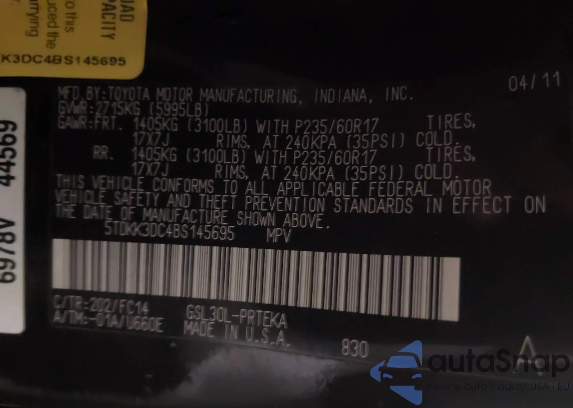 Автомобиль Toyota Sienna 2011 (VIN 5TDKK3DC4BS145695) ранее не участвовал в торгах. Документы чистые, пробег соответствует или ниже среднего по рынку. Продаётся страховой компанией — рекомендуем покупку. Доставка в порт займет около 6–8 недель.