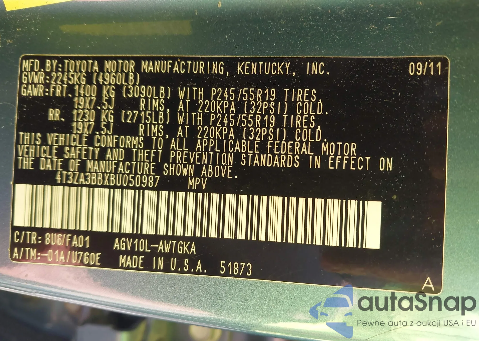 VIN: 4T3ZA3BBXBU050987