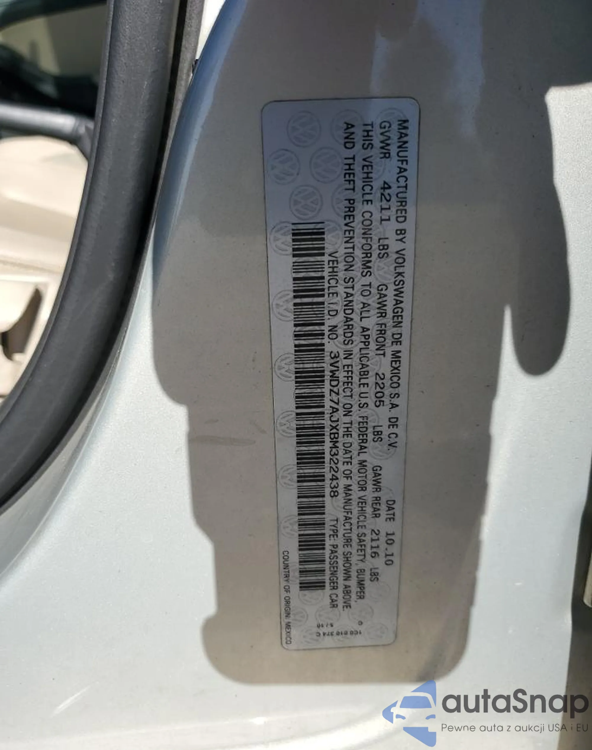 Автомобиль Volkswagen Jetta 2011 (VIN 3VWDZ7AJXBM322438) имеет документы, препятствующие регистрации. Могут возникнуть сложности при экспорте и регистрации. Обратитесь к экспертам AutaSnap для поиска альтернатив.