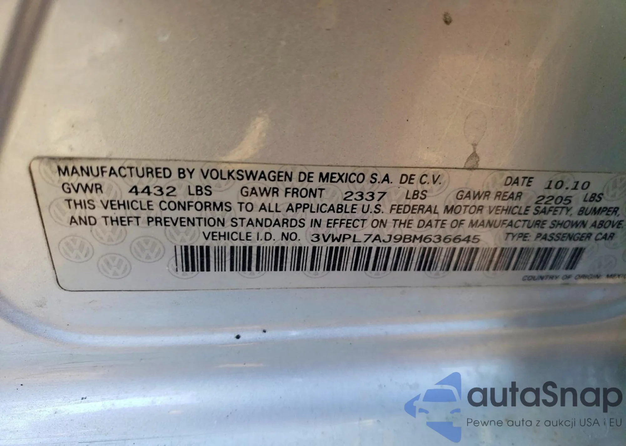 Автомобиль Volkswagen Jetta 2011 (VIN 3VWPL7AJ9BM636645) ранее не участвовал в торгах. Документы чистые, пробег соответствует или ниже среднего по рынку. Продаётся страховой компанией — рекомендуем покупку. Доставка в порт займет около 6–8 недель.