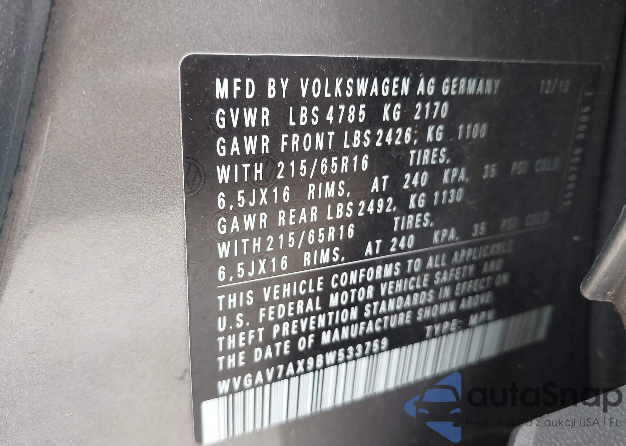 VIN: WVGAV7AX9BW533759