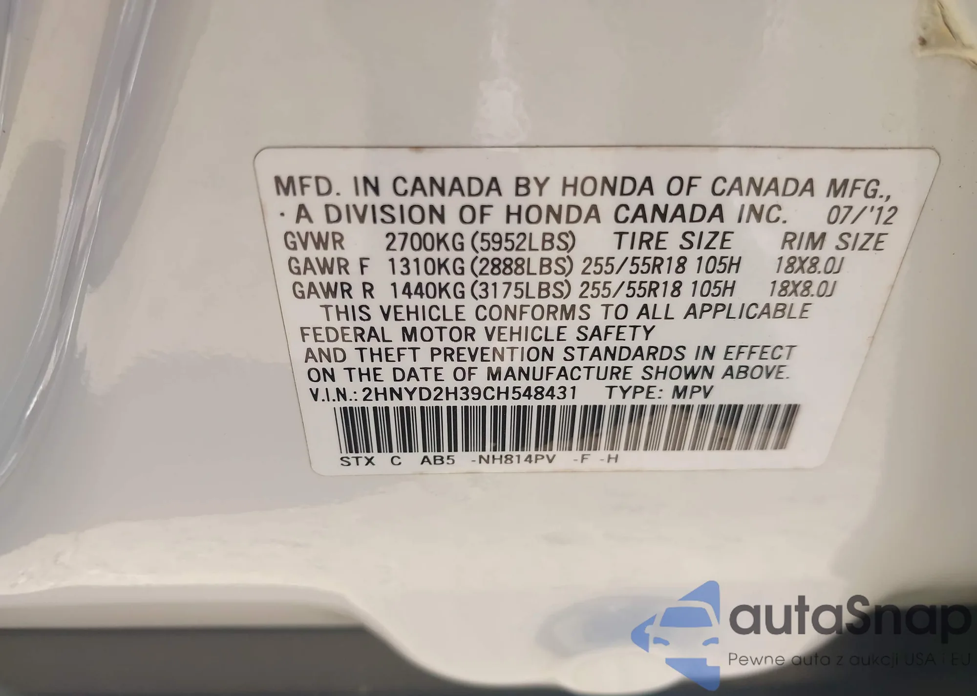 VIN: 2HNYD2H39CH548431