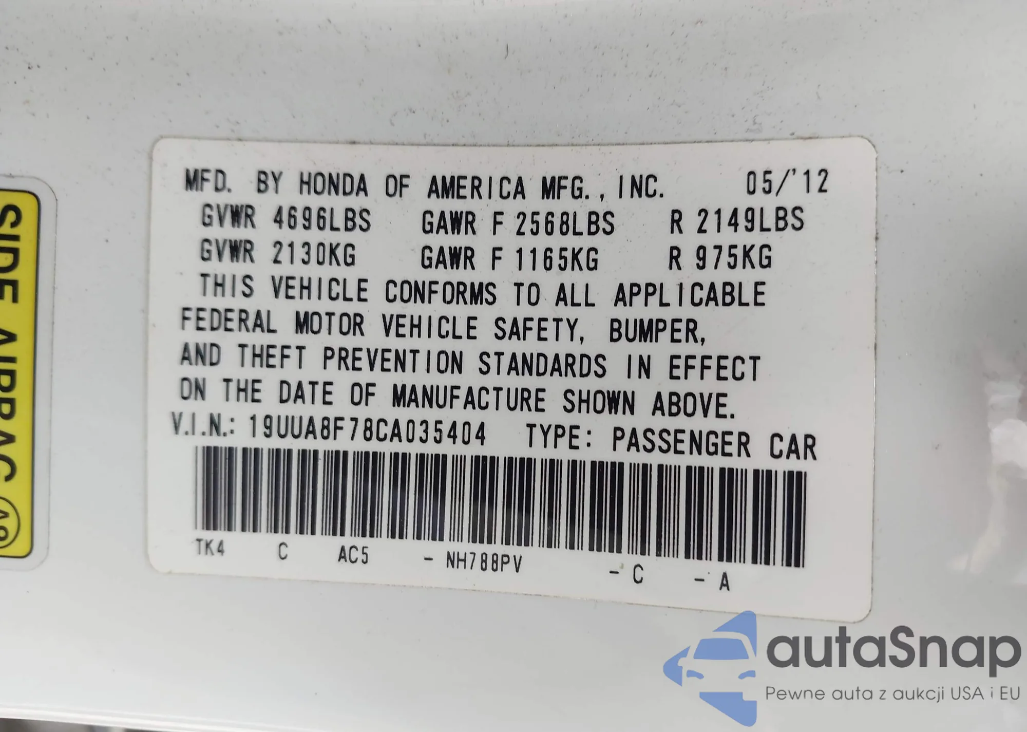 • VIN: 19UUA8F78CA035404