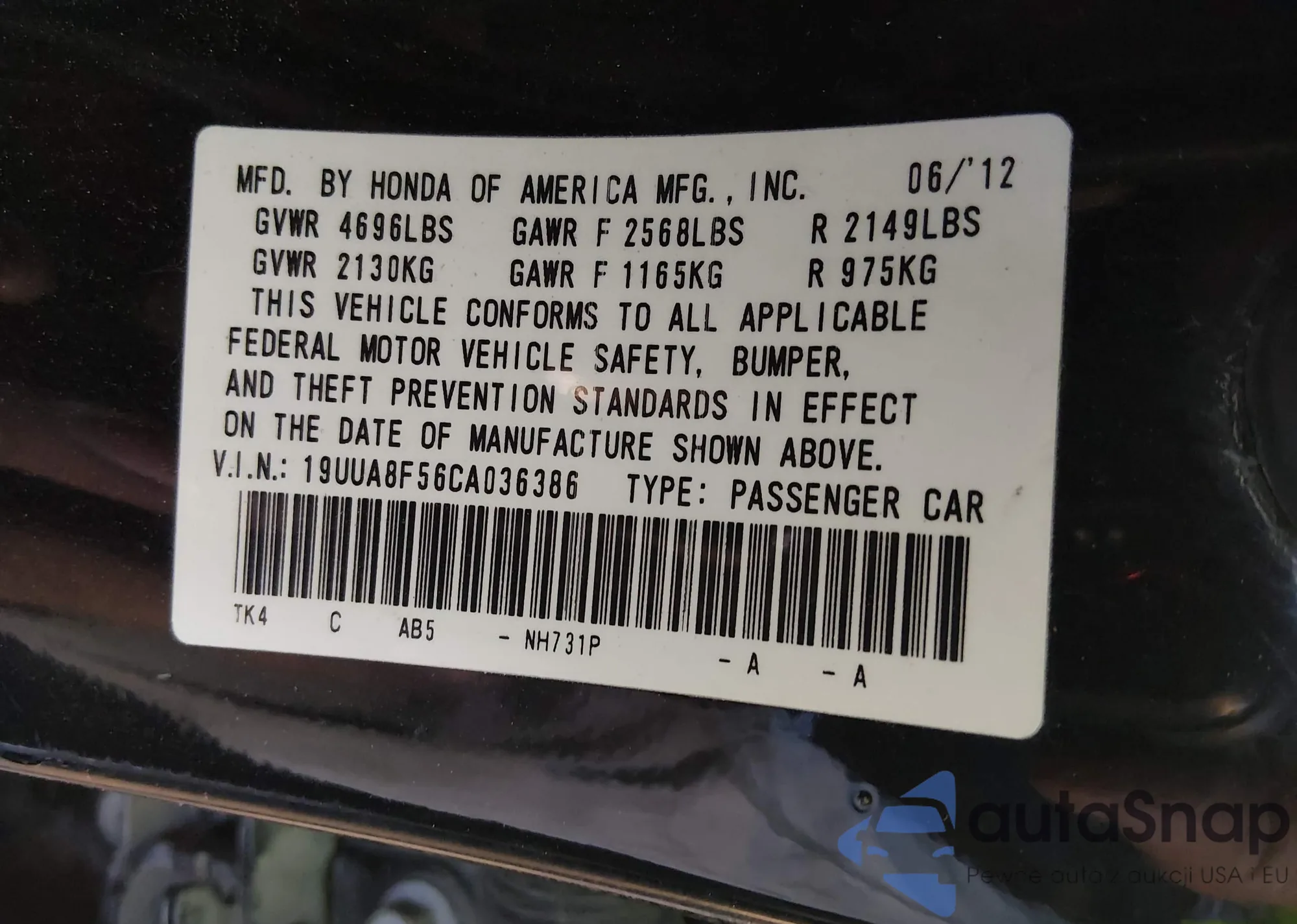 • VIN: 19UUA8F56CA036386