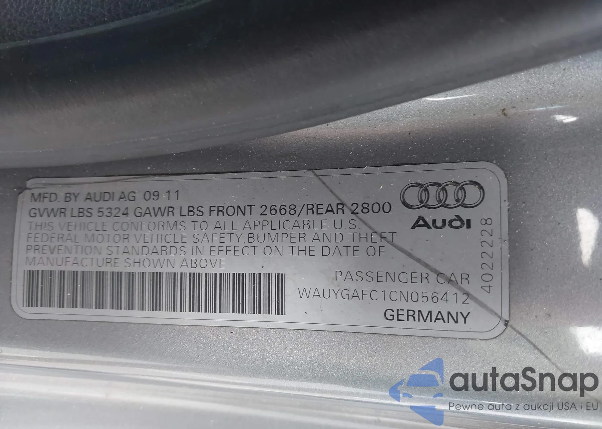 Автомобиль Audi A7 2012 (VIN WAUYGAFC1CN056412) имеет документы, препятствующие регистрации. Могут возникнуть сложности при экспорте и регистрации. Обратитесь к экспертам AutaSnap для поиска альтернатив.