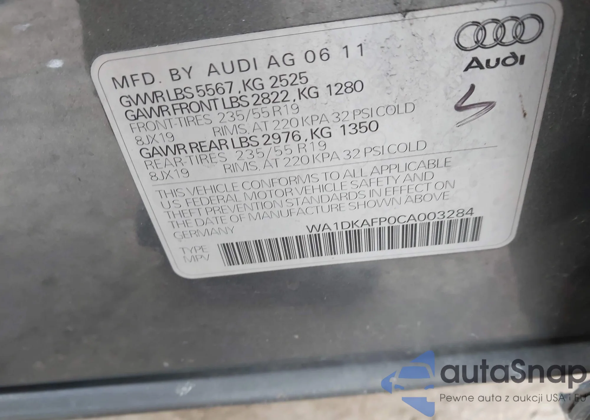 • VIN: WA1DKAFP0CA003284