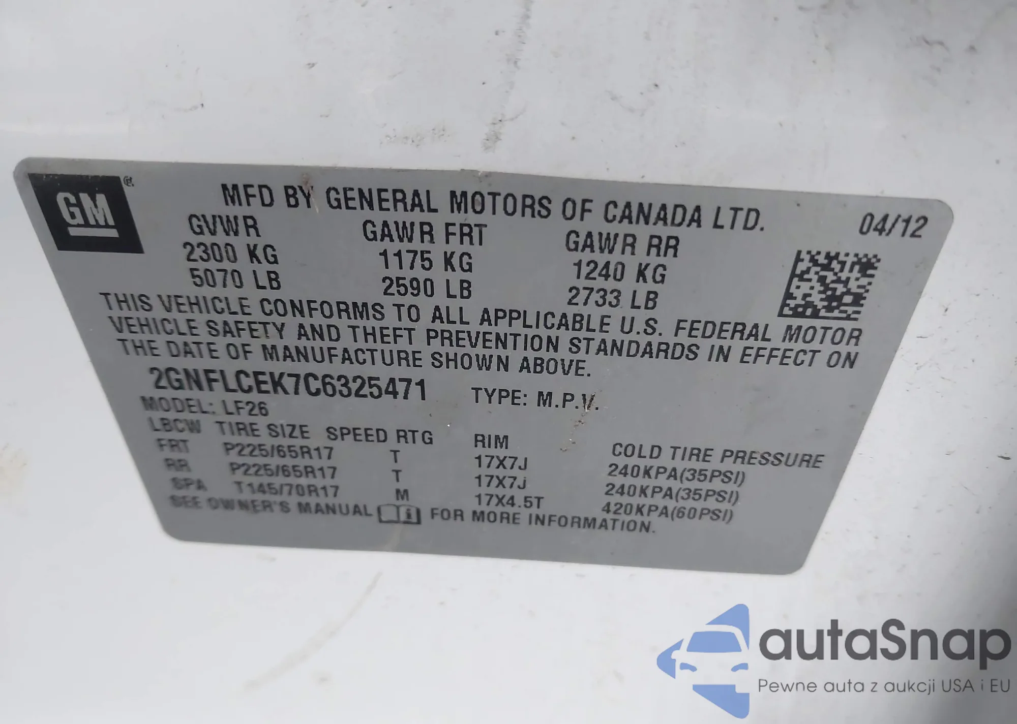 Автомобиль Chevrolet Equinox 2012 (VIN 2GNFLCEK7C6325471) ранее не участвовал в торгах. Документы чистые, пробег соответствует или ниже среднего по рынку. Продаётся страховой компанией — рекомендуем покупку. Доставка в порт займет около 6–8 недель.