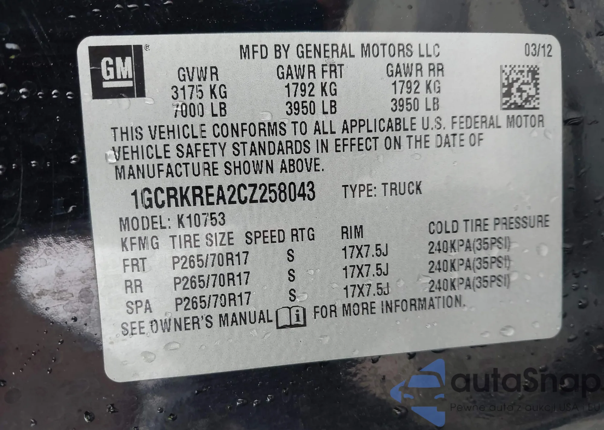 • VIN: 1GCRKREA2CZ258043
