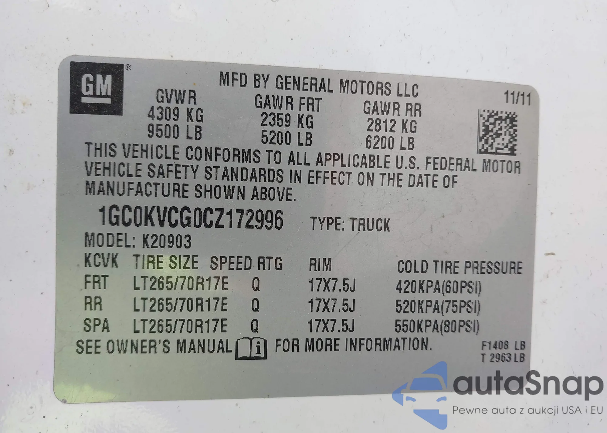 • VIN: 1GC0KVCG0CZ172996