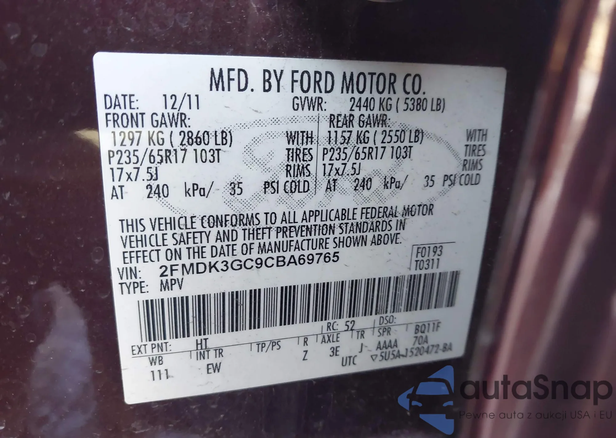 Автомобиль Ford Edge 2012 (VIN 2FMDK3GC9CBA69765) ранее не участвовал в торгах. Документы чистые, пробег соответствует или ниже среднего по рынку. Продаётся страховой компанией — рекомендуем покупку. Доставка в порт займет около 6–8 недель.