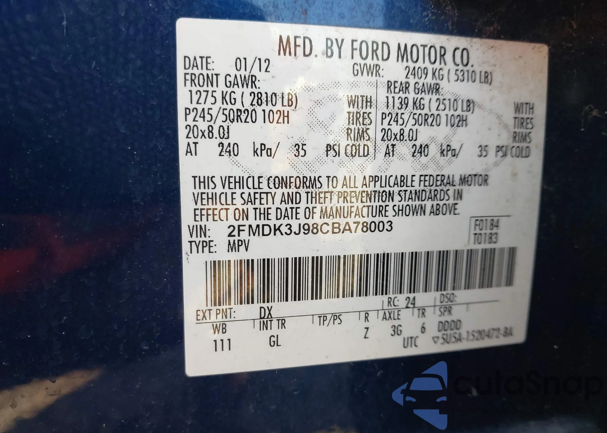 VIN: 2FMDK3J98CBA78003