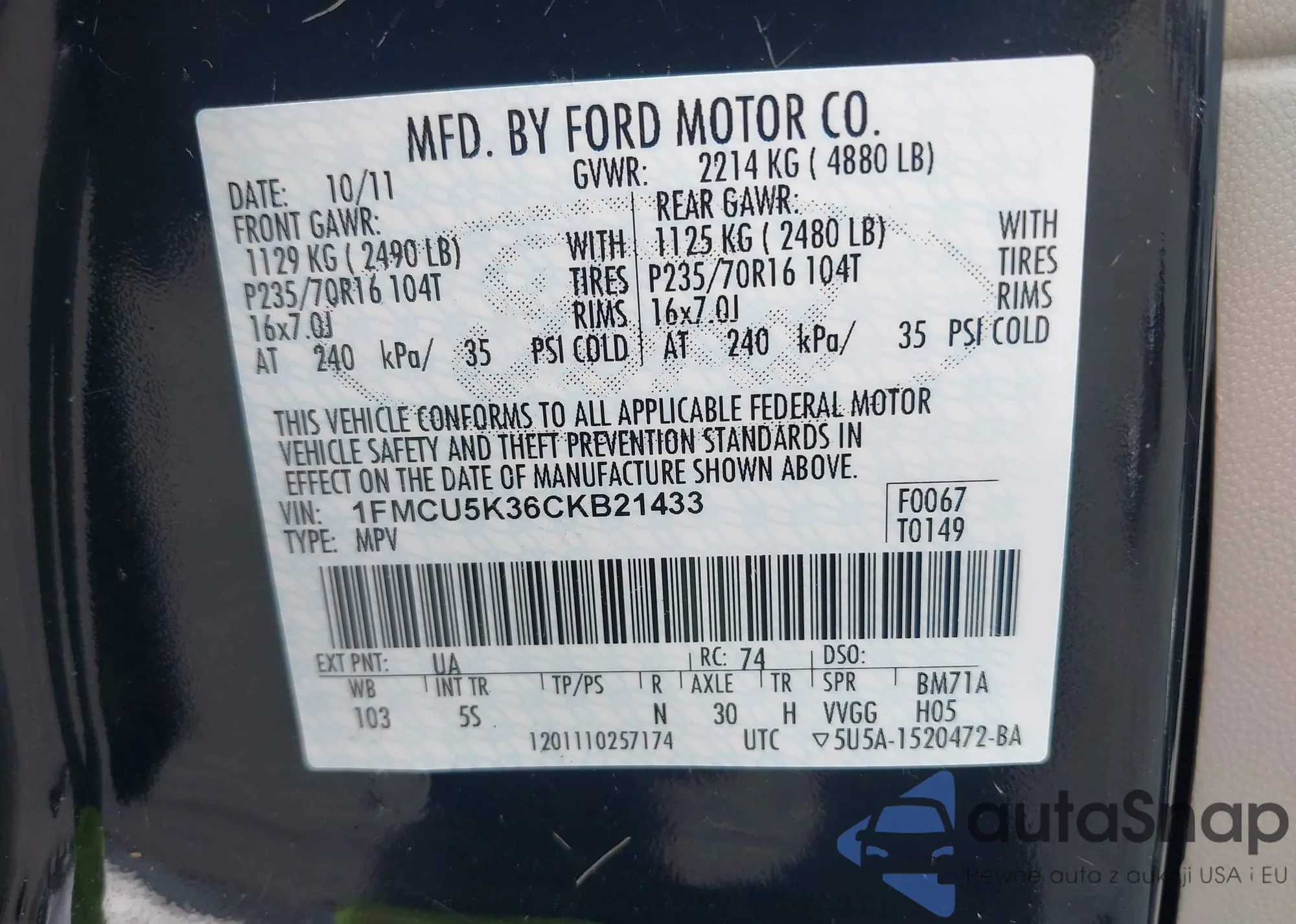 VIN: 1FMCU5K36CKB21433