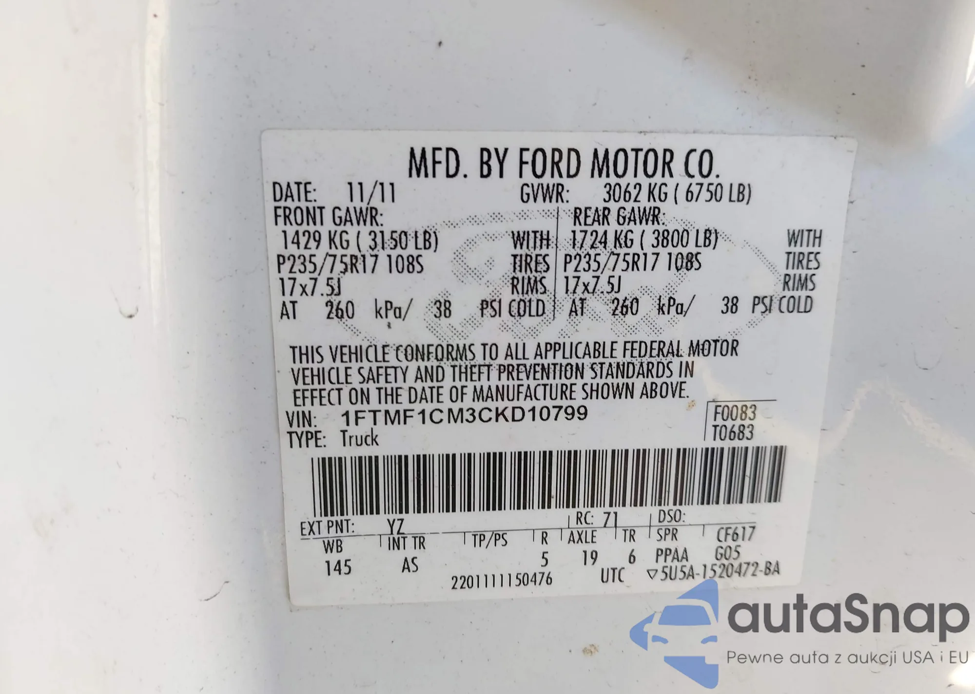 Автомобиль Ford F-150 2012 (VIN 1FTMF1CM3CKD10799) продаётся непроверенным продавцом. Рекомендуем проверить отчет Carfax и подтвердить возможность регистрации перед покупкой.