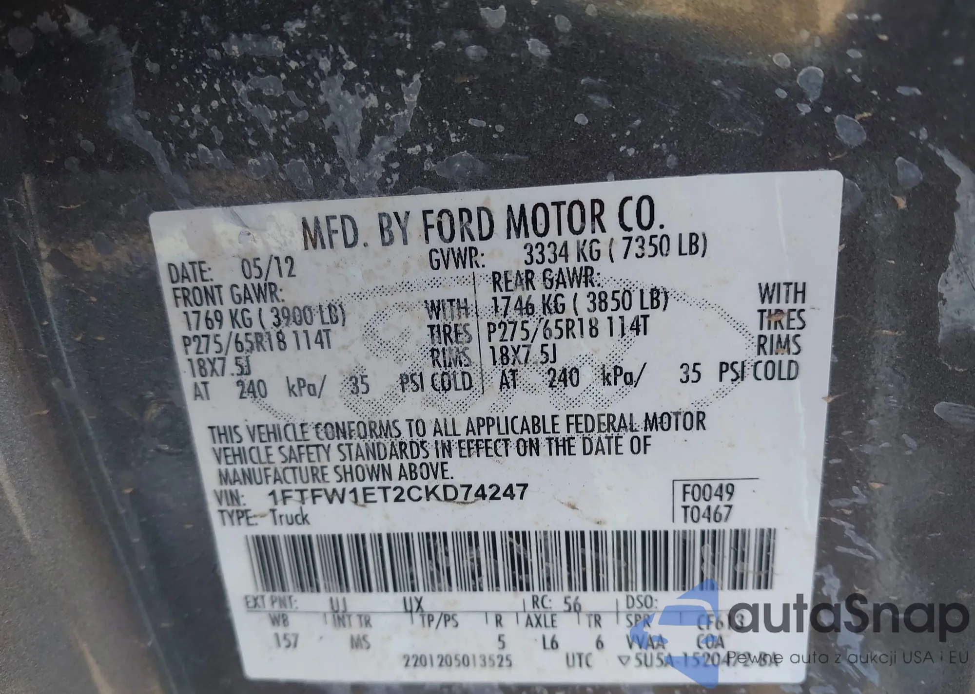 Автомобиль Ford F-150 2012 (VIN 1FTFW1ET2CKD74247) ранее не участвовал в торгах. Документы чистые, пробег соответствует или ниже среднего по рынку. Продаётся страховой компанией — рекомендуем покупку. Доставка в порт займет около 6–8 недель.