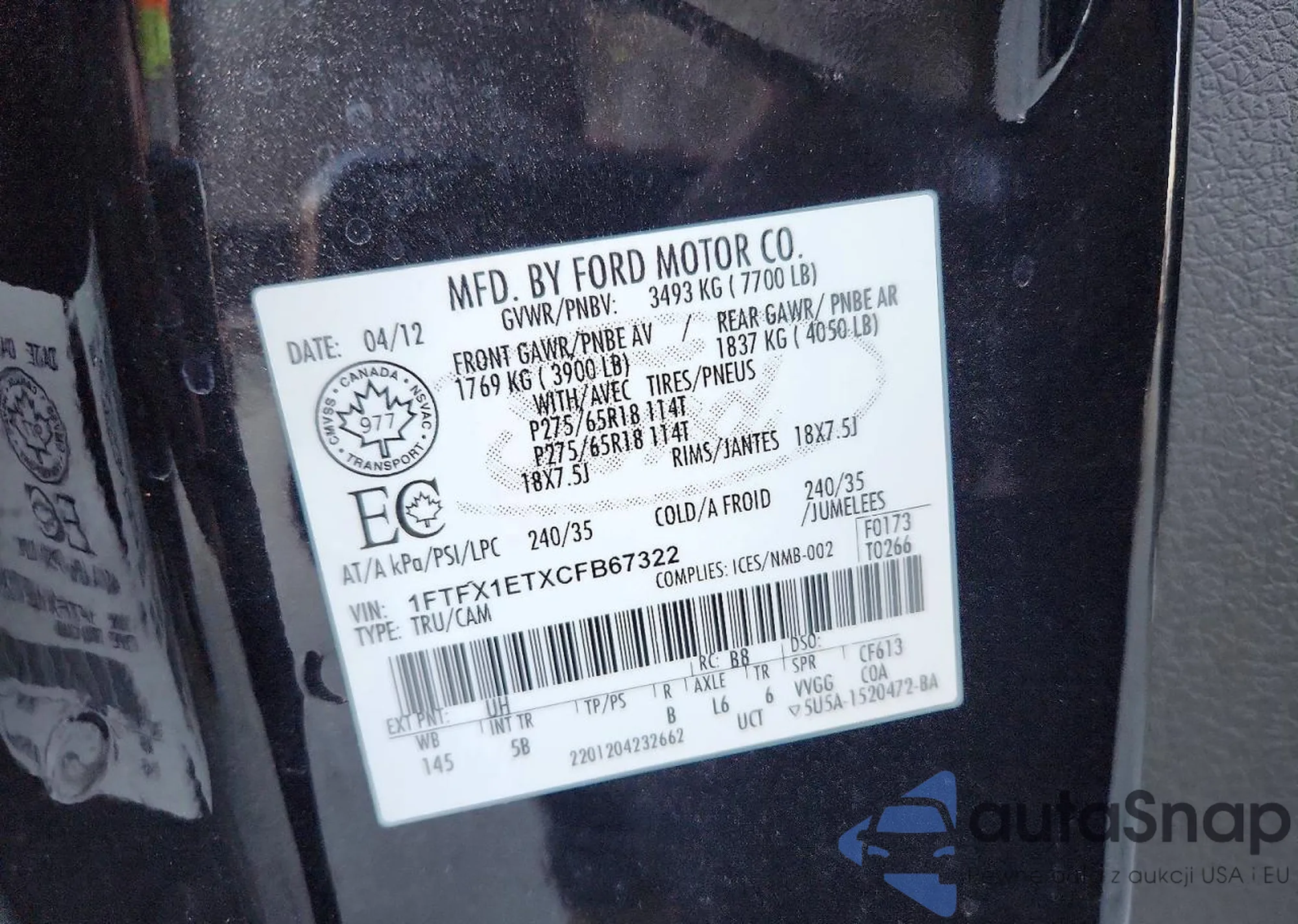VIN: 1FTFX1ETXCFB67322