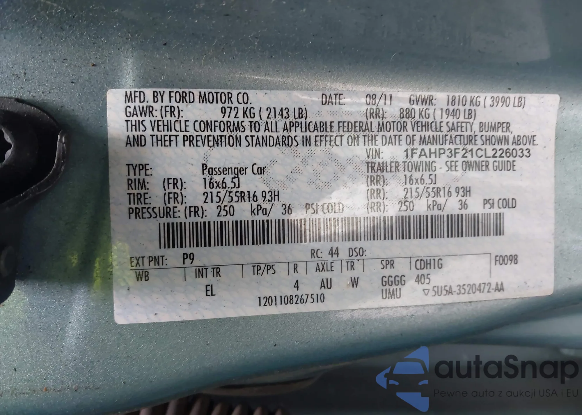 • VIN: 1FAHP3F21CL226033