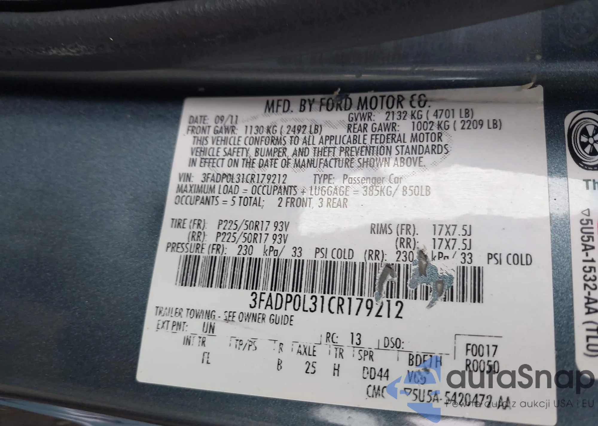 • VIN: 3FADP0L31CR179212