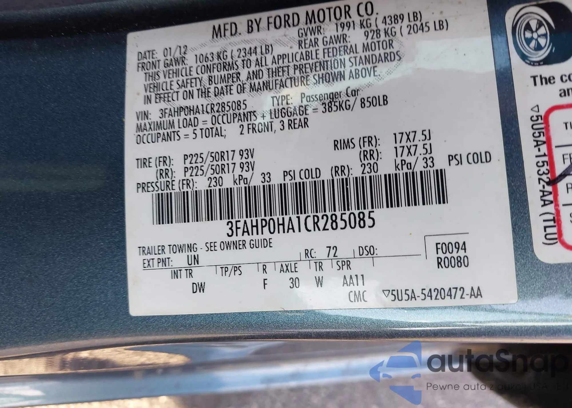 VIN: 3FAHP0HA1CR285085