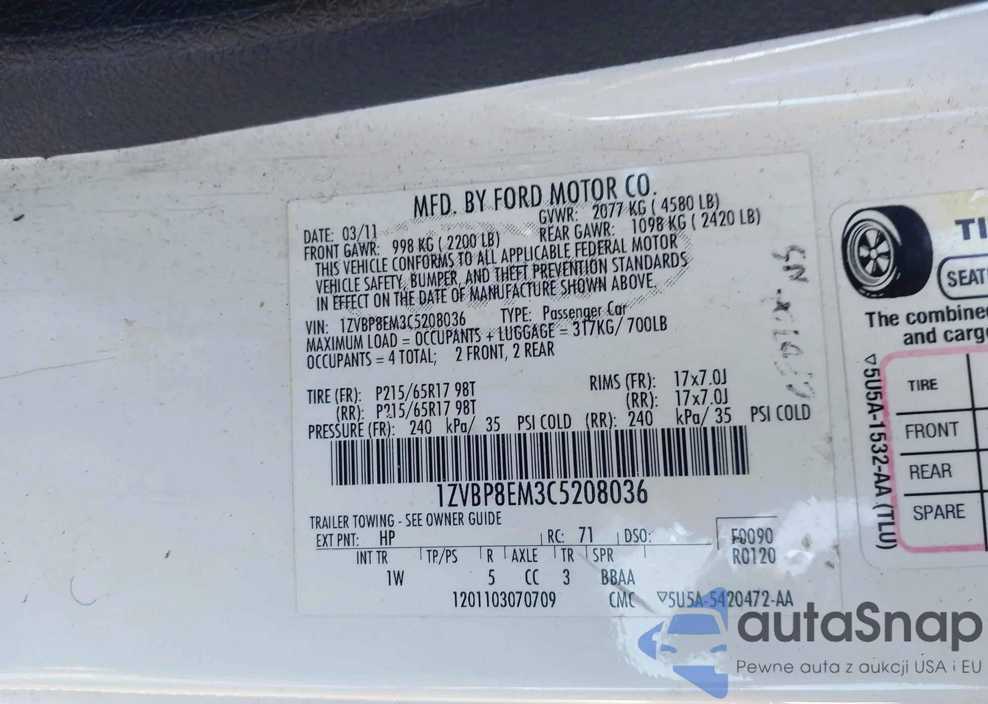 VIN: 1ZVBP8EM3C5208036