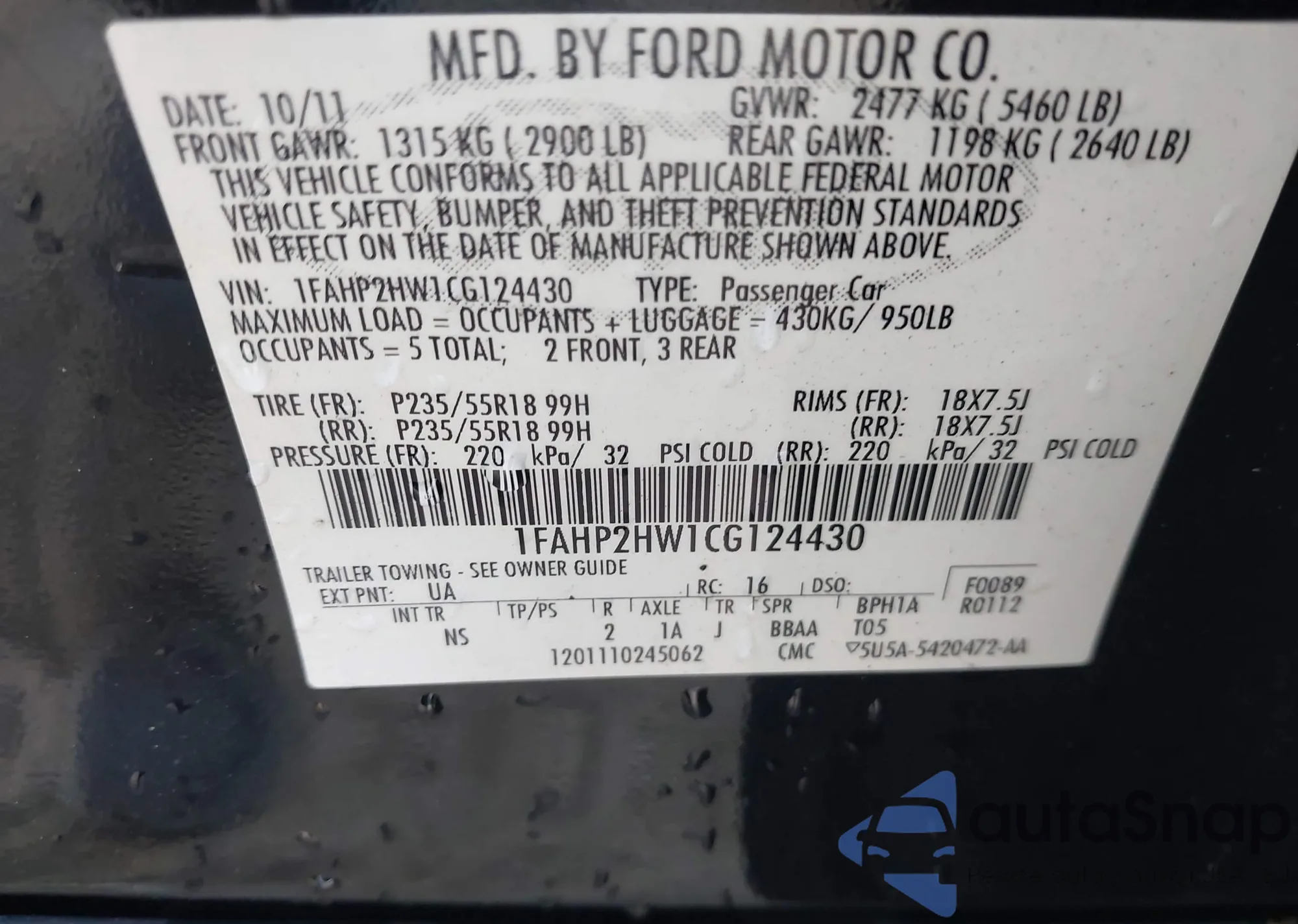 • VIN: 1FAHP2HW1CG124430