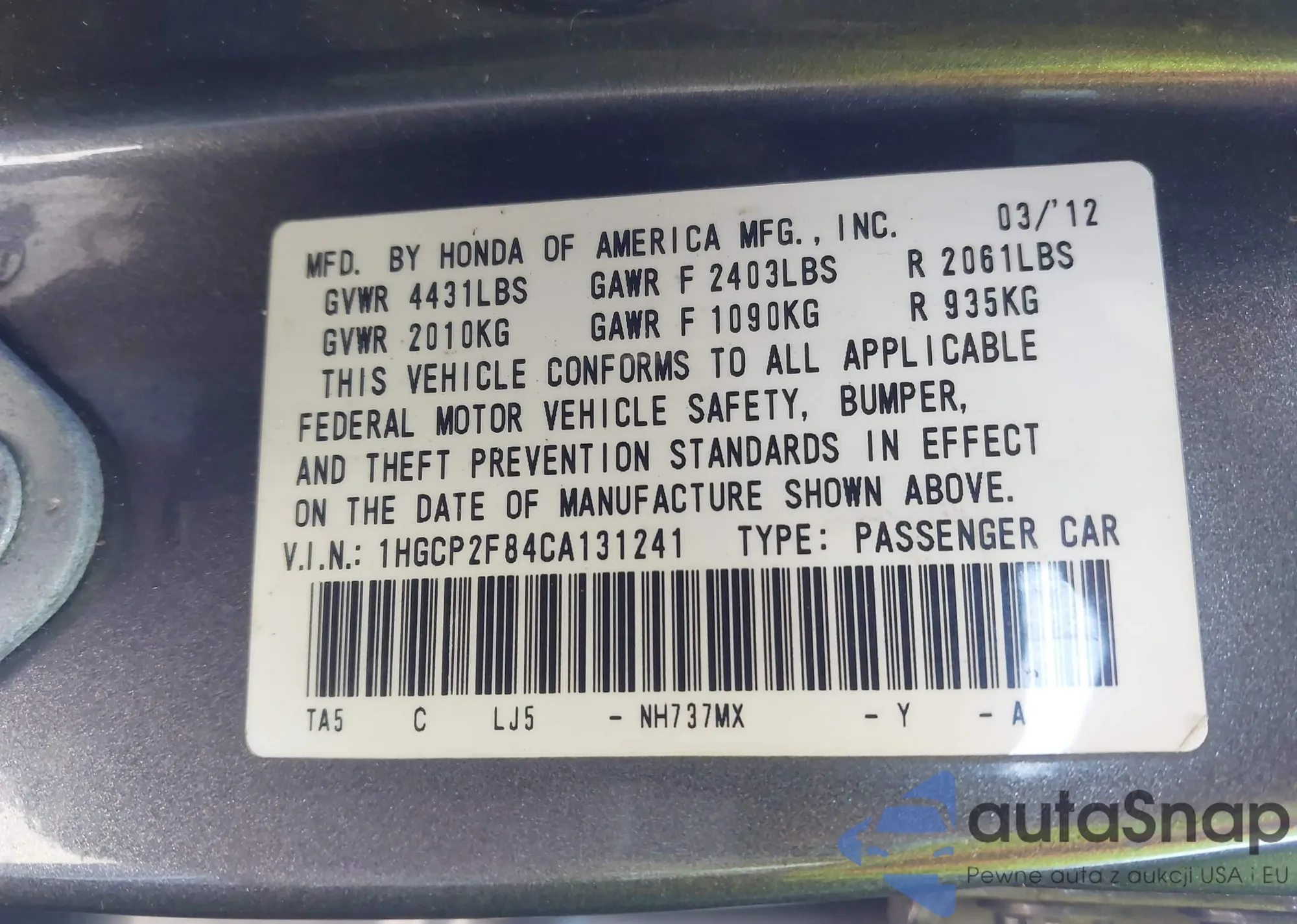 VIN: 1HGCP2F84CA131241