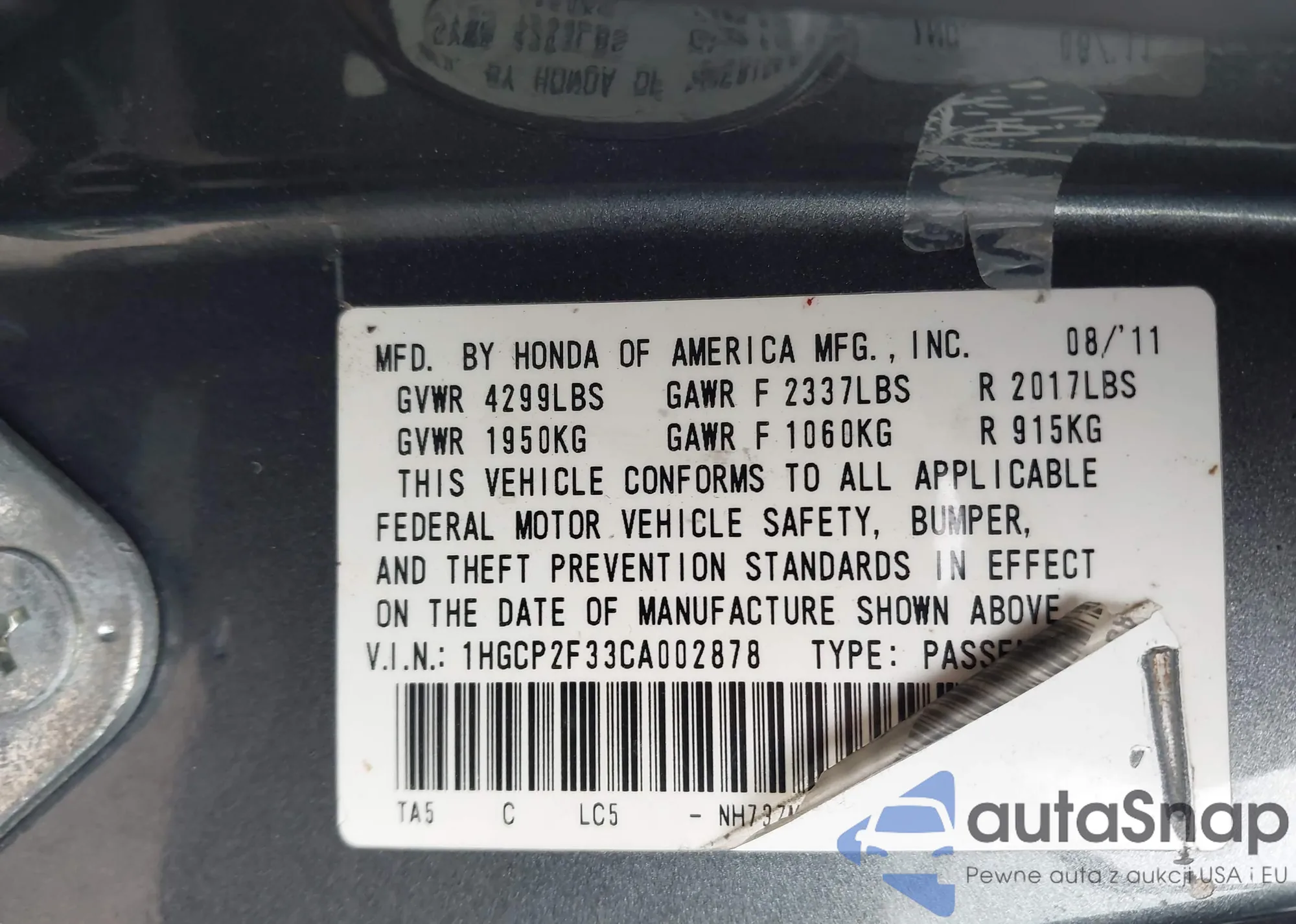• VIN: 1HGCP2F33CA002878