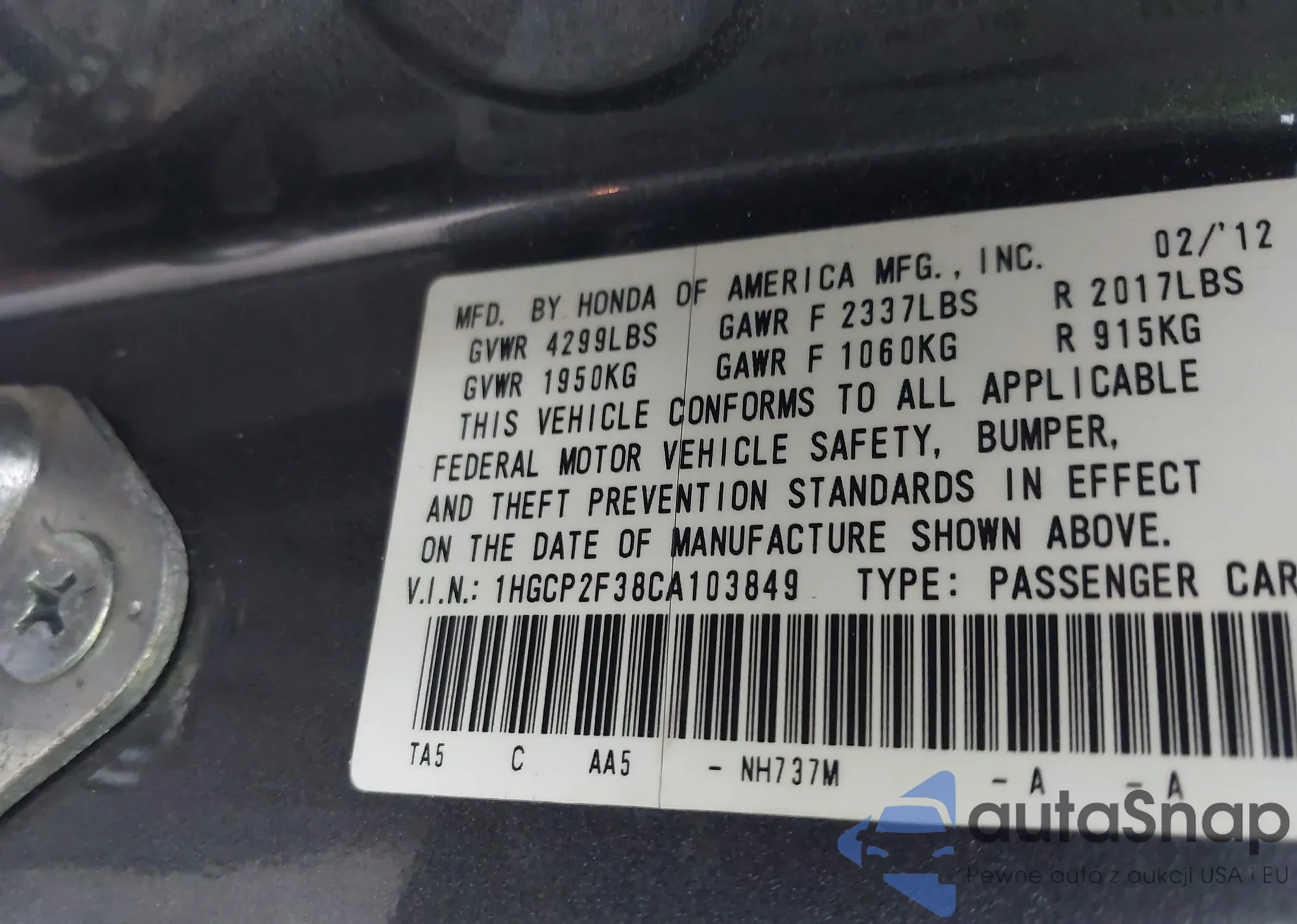VIN: 1HGCP2F38CA103849