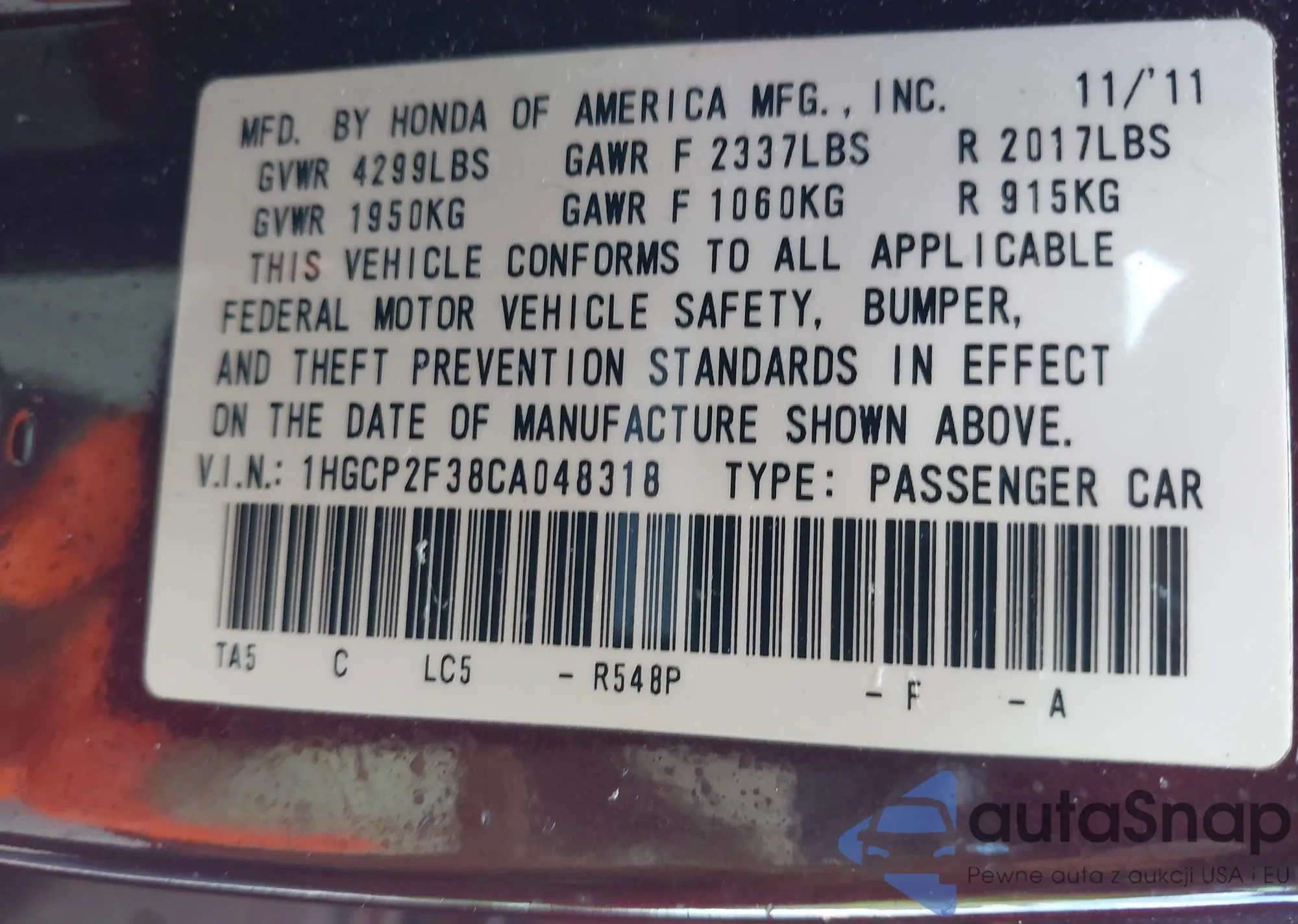 VIN: 1HGCP2F38CA048318