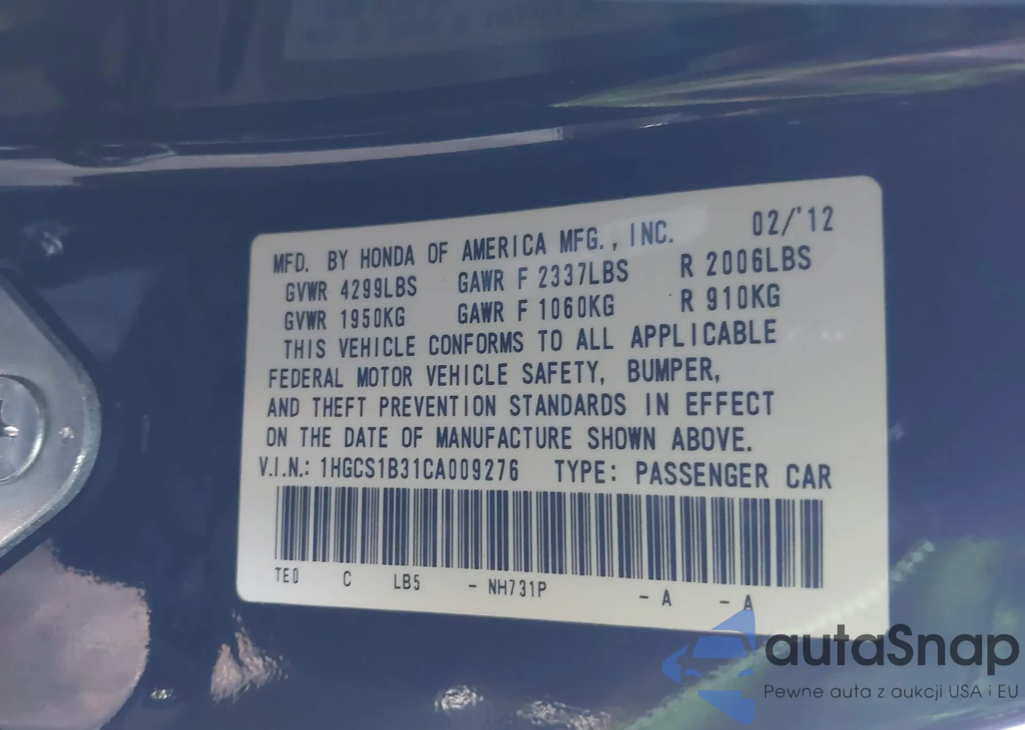 Автомобиль Honda Accord 2012 (VIN 1HGCS1B31CA009276) ранее не участвовал в торгах. Документы чистые, пробег соответствует или ниже среднего по рынку. Продаётся страховой компанией — рекомендуем покупку. Доставка в порт займет около 6–8 недель.
